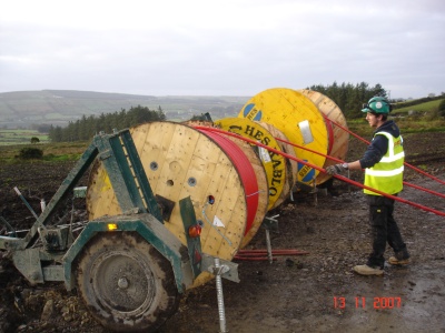 Curragh Windfarm - Millstreet in Cork is an extension to the existing Airtricity windfarm adding a further 13.5mw of green power to the national grid. 630sq / 120sq Alu A2XS(FL)2Y12/20kV were pulled through preinstalled ducts throughout the site. 8km of 20kv cables and 5km of fibre optics were installed in 6 working days.